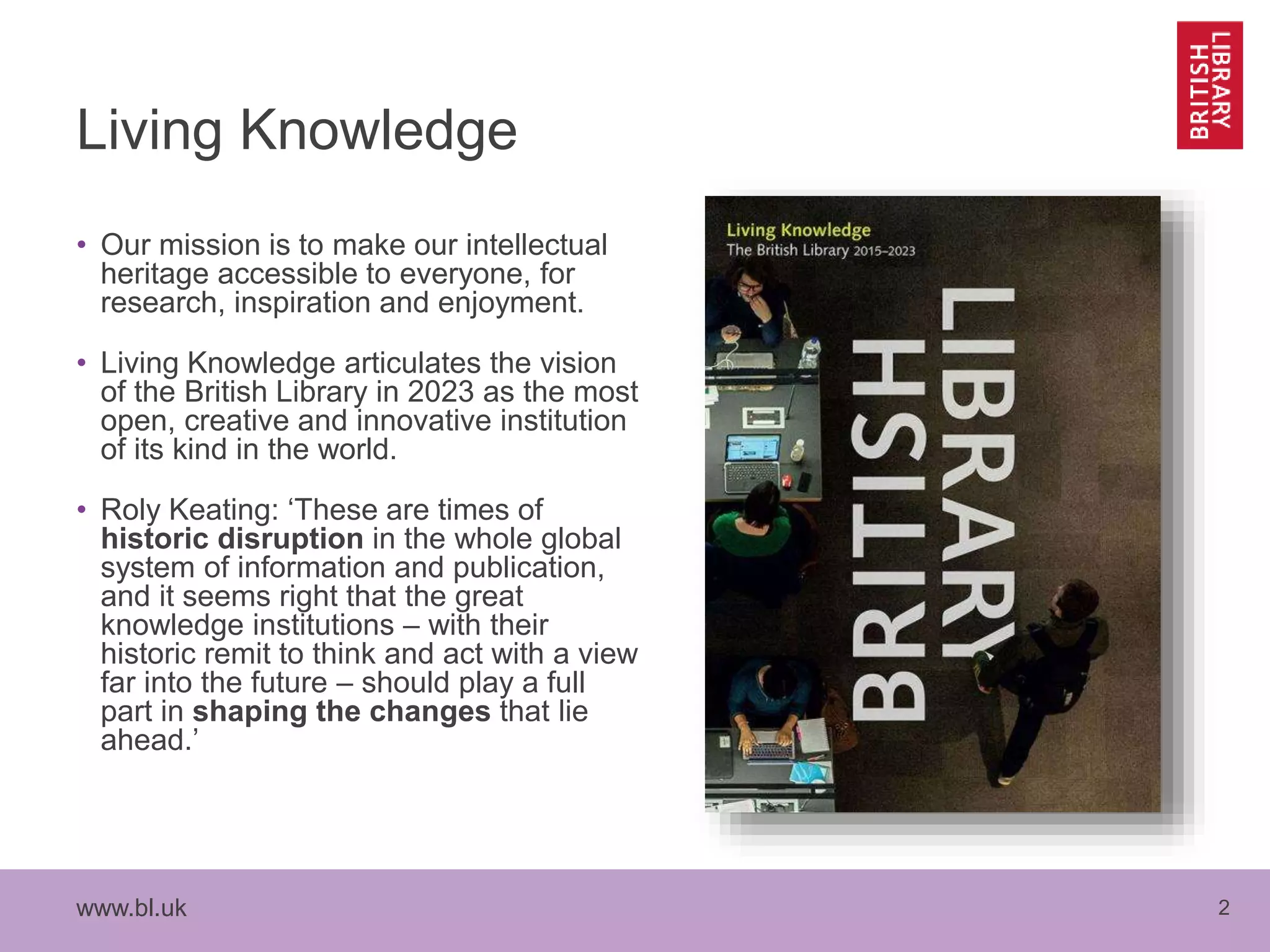 The document outlines the British Library's vision for 2023, aiming to be the most open and innovative institution for research, fostering access and collaboration in a rapidly changing information landscape. It emphasizes the importance of digitizing collections, enhancing user experience, and developing new services and infrastructures for discovery and access. Key initiatives include making heritage collections available internationally and integrating research data into library services.