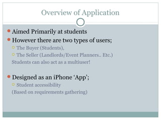 Everything Student Life is an app aimed at connecting students looking for accommodation or to sell goods with landlords and other students. It uses a user-centered design approach involving requirements gathering, personas, use cases and testing. The app allows students to browse and refine housing searches. It also enables landlords to upload accommodation listings. Usability testing was conducted on paper prototypes and a working prototype to improve the interface based on user feedback. Design principles like Nielsen's heuristics and Pressman's principles were applied to the prototype.