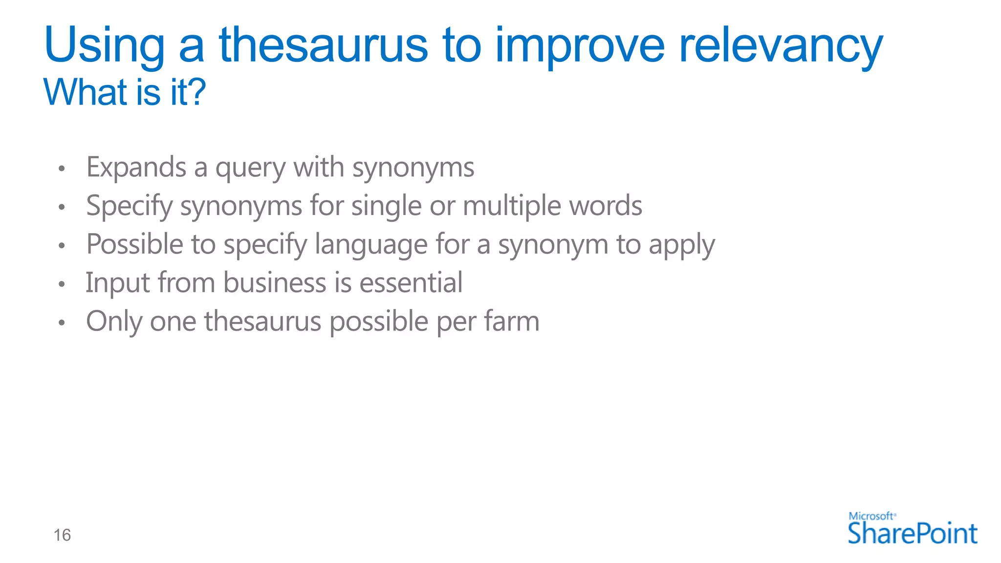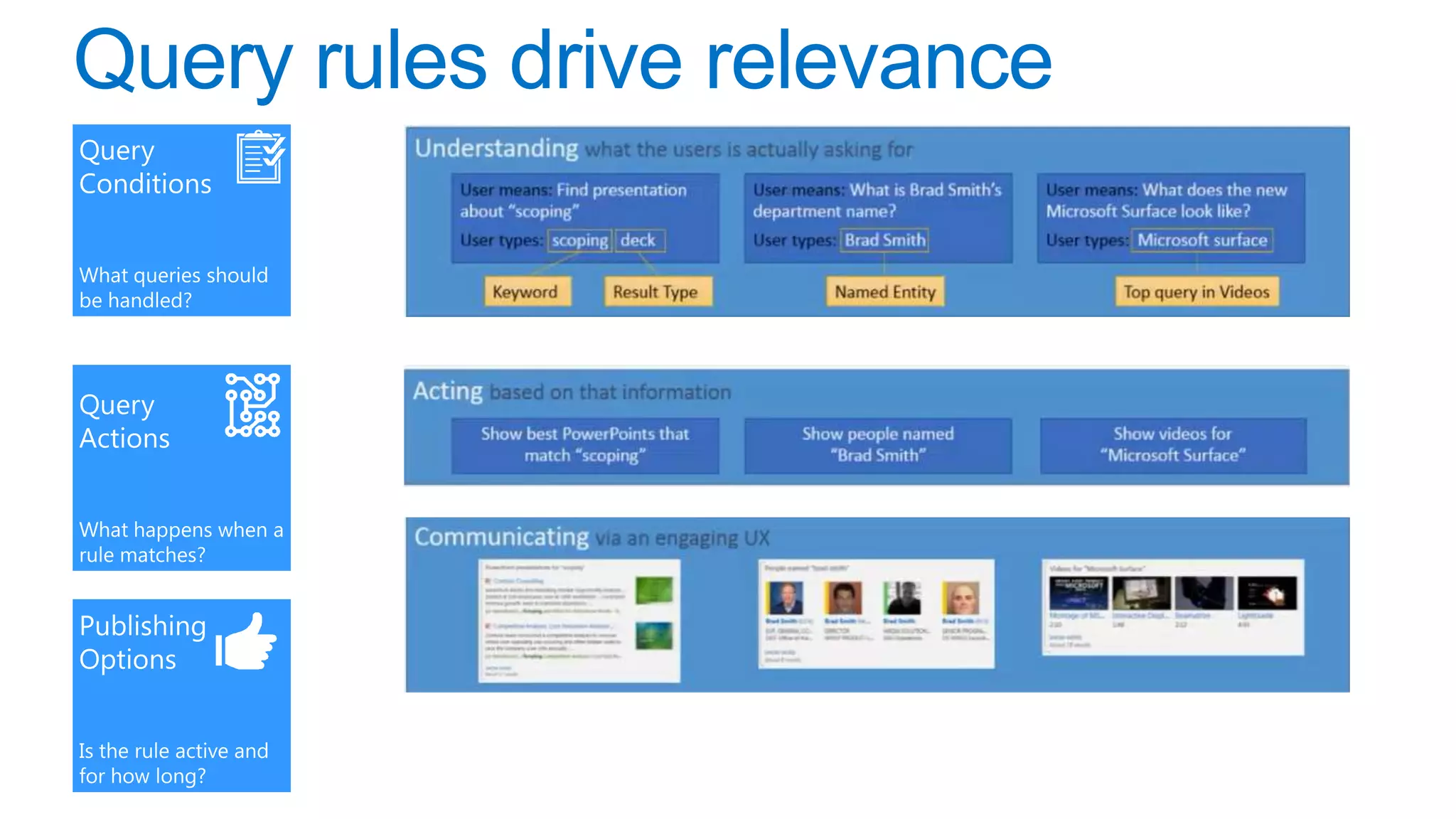 The document discusses options for configuring search in SharePoint to improve relevance, including query rules, thesaurus, dynamic reordering rules, authorities, and ranking models. It provides examples of using each option to refine search results for specific queries. The options allow driving relevance through phrase-based, historical, and curated matches, as well as rewriting the user's query.