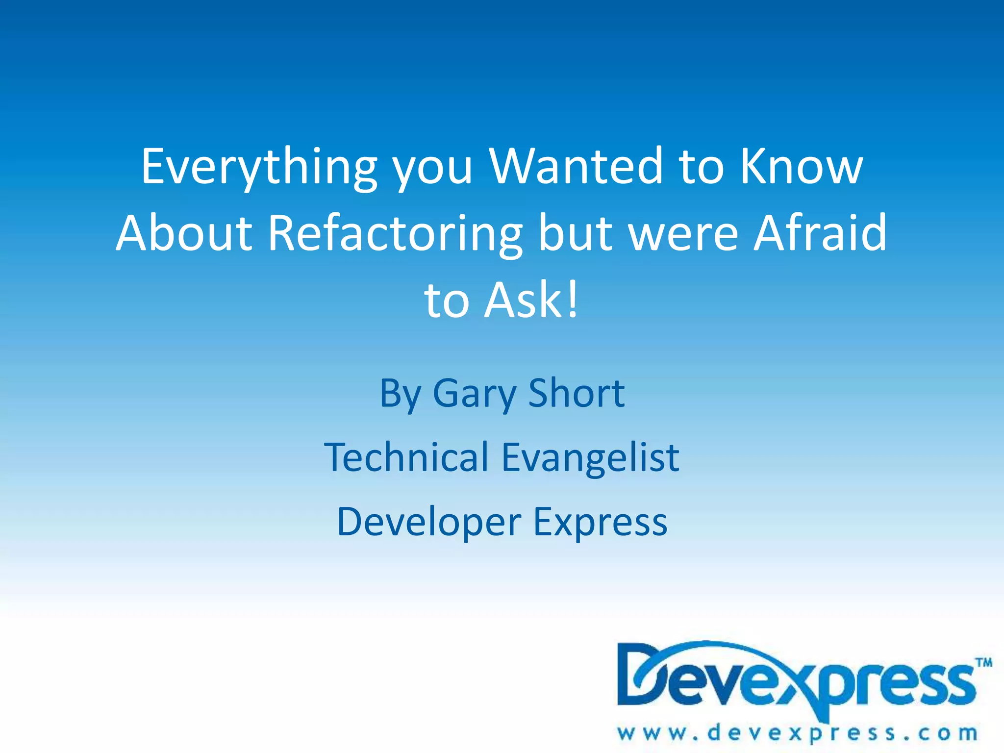 This document discusses the concept of refactoring, which is the process of changing a program's internal structure without altering its external functionality to improve code quality. It emphasizes the importance of refactoring in managing technical debt, encourages developers to evaluate when and how to refactor, and highlights the benefits of using tooling in the refactoring process. The author, Gary Short, also provides resources for further reading and shares his background as a technical evangelist.