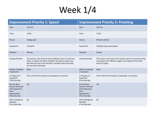 This document summarizes a 4-week training program and mid-point review for an athlete. In weeks 1-4, the athlete worked on improving speed and finishing in gym and field sessions. Coaches' reviews note progress in both areas. Testing at week 4 shows average to good improvement in sprint times and goals scored. The review finds the planned weeks 5-8 do not need adapting as the athlete is making steady progress toward goals.