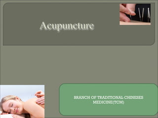 The document discusses acupuncture, its history and practices. It provides information on the types of acupuncture including moxibustion and cupping. It explains the philosophy of acupuncture regarding balance of yin and yang energies. It discusses mechanisms of action including the release of endorphins. Indications for acupuncture include pain management, respiratory diseases and orthopedic disorders. The document promotes courses in acupuncture therapy provided by the Global College of Paramedical Sciences in Madurai, India.
