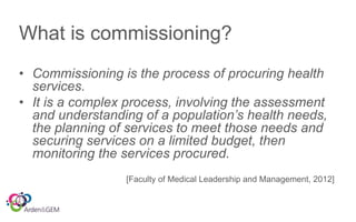 The document discusses evidence-based commissioning in healthcare, emphasizing the complex process of assessing health needs, planning, procuring, and monitoring services within budget constraints. It highlights the challenges faced by commissioners in finding reliable evidence and suggests leveraging expert groups, tailored librarian services, and collaborative resources to enhance decision-making. Key lessons include the importance of understanding the customer's needs and providing succinct, actionable information to facilitate efficient service delivery.
