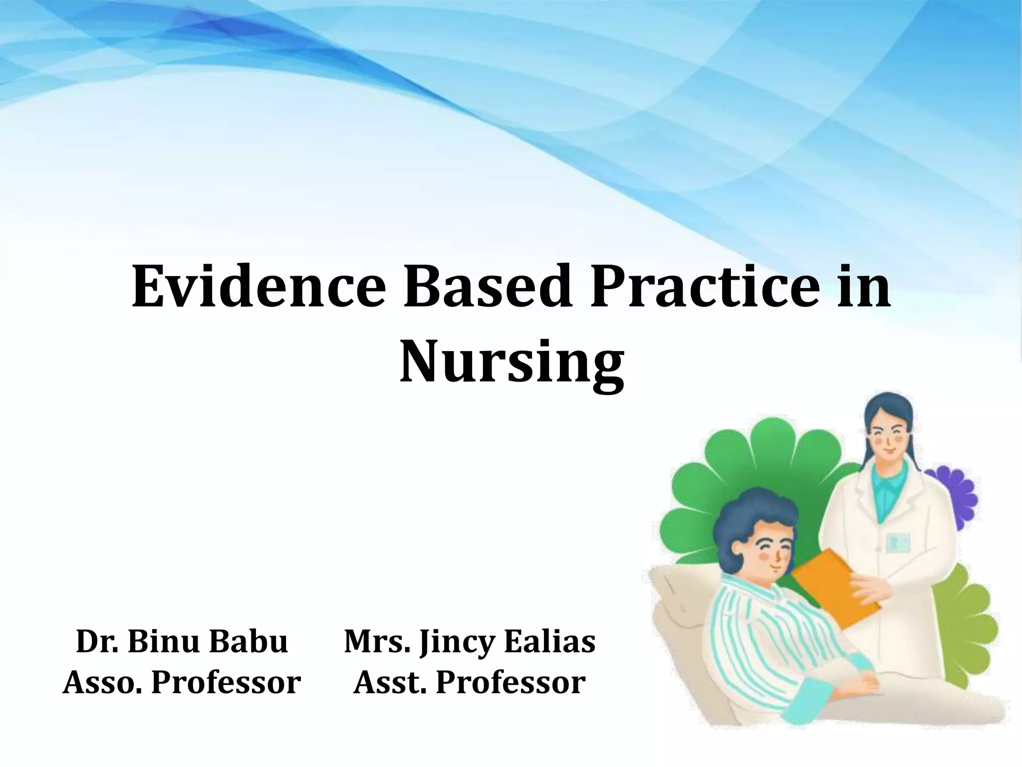 This document discusses evidence-based practice (EBP) in nursing. It defines EBP as making clinical decisions based on evidence from scientific research combined with clinical experience and patient preferences. The history of EBP in nursing began in the 1970s with projects that developed research-based clinical protocols and demonstrated improved patient outcomes. EBP requires nurses to critically assess scientific evidence and implement high-quality interventions. It can help standardize care, reduce delays, and increase confidence in decision-making while maintaining professional standards and guiding further research. Factors that facilitate EBP include knowledge, skills, beliefs, capabilities, tools, and mentors while barriers include lack of value for research and lack of time, resources, and administrative support.