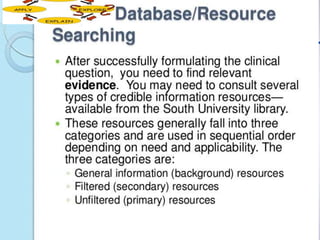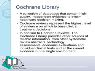 This document provides an introduction to evidence-based practice (EBP). It defines EBP as using the best available research evidence, along with clinical expertise and patient values, to guide patient care. The document discusses the history and importance of EBP, outlines the steps of EBP including framing clinical questions and searching for evidence, and identifies some barriers and facilitators to implementing EBP. The overall purpose is to familiarize readers with the core concepts and process of evidence-based practice in nursing.