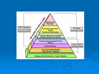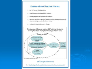 The document discusses the importance of evidence-based practice (EBP) in nursing, emphasizing its role in improving patient care and outcomes by integrating research evidence with clinical expertise and patient values. It outlines the process of EBP, including identifying clinical questions using the PICOT format, searching for high-quality evidence, and critically appraising and applying the findings to practice. The document also highlights barriers to EBP implementation, the need for ongoing education, and strategies to promote a culture of inquiry and evidence utilization in healthcare settings.