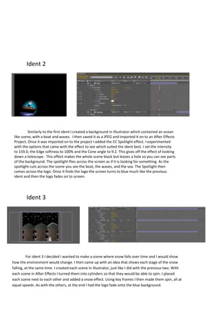 This document describes 6 ident projects created in After Effects. The first ident features a moon tied to a tree that rocks in the wind while text appears on it. A cloud forms the company logo. The second uses a CC Spotlight effect to reveal a scene of a boat and ocean as the spotlight searches and finds the logo. The third shows snow falling over time across spinning cylinder scenes, with the logo appearing at the end. The fourth is a simple stickman animation. The fifth changes text effects to look like lava and water before combining with the logo. The sixth has bouncing text that jumps up and floats down onto the logo.
