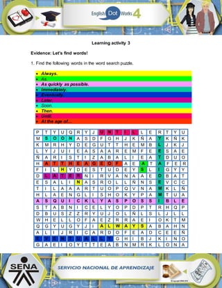 The document provides instructions for a learning activity that involves finding words in a word search puzzle and identifying correct and incorrect use of time words and phrases in example sentences. Students are asked to find 10 words in the word search, write R if a sentence using time words is correct or W if it is incorrect and provide the correction. When finished, students are to submit their work through the online platform and leave an optional comment for the instructor. The work will be evaluated on the student's ability to exchange personal information about relevant life events using proper grammar, vocabulary and context.