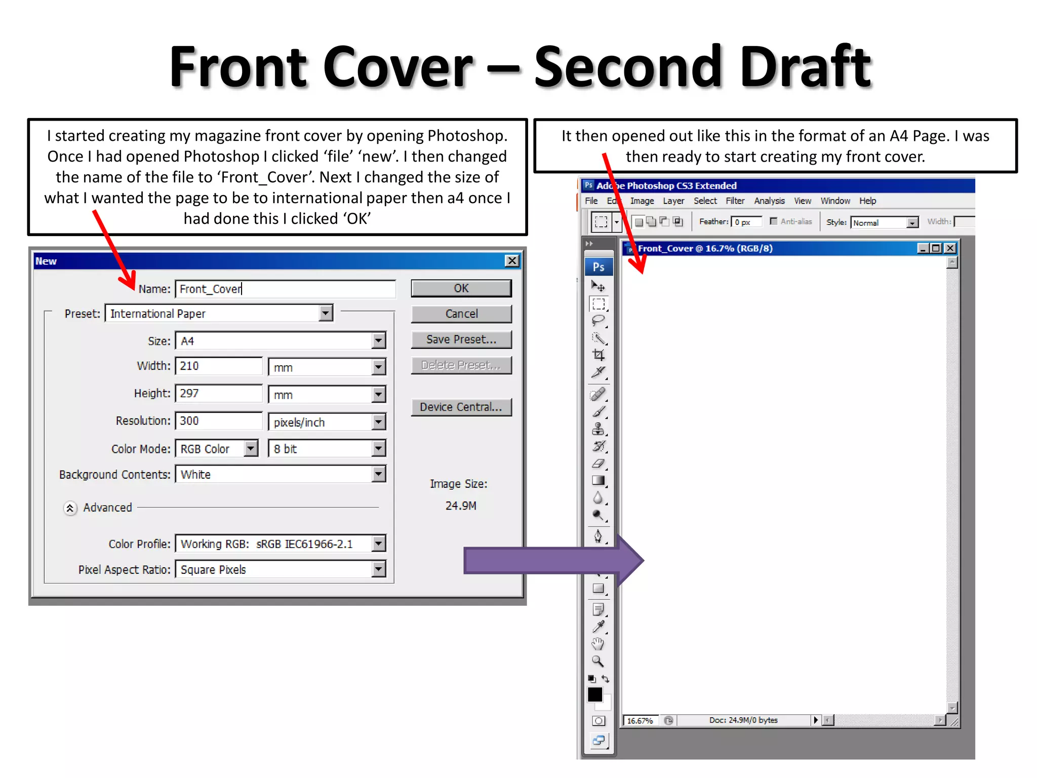 1) The document provides details of the process of creating and revising the front cover design for a magazine in Photoshop. It describes opening Photoshop, setting up the page size, adding a cloud background effect, importing an image for the splash page, erasing the background, and positioning the image.