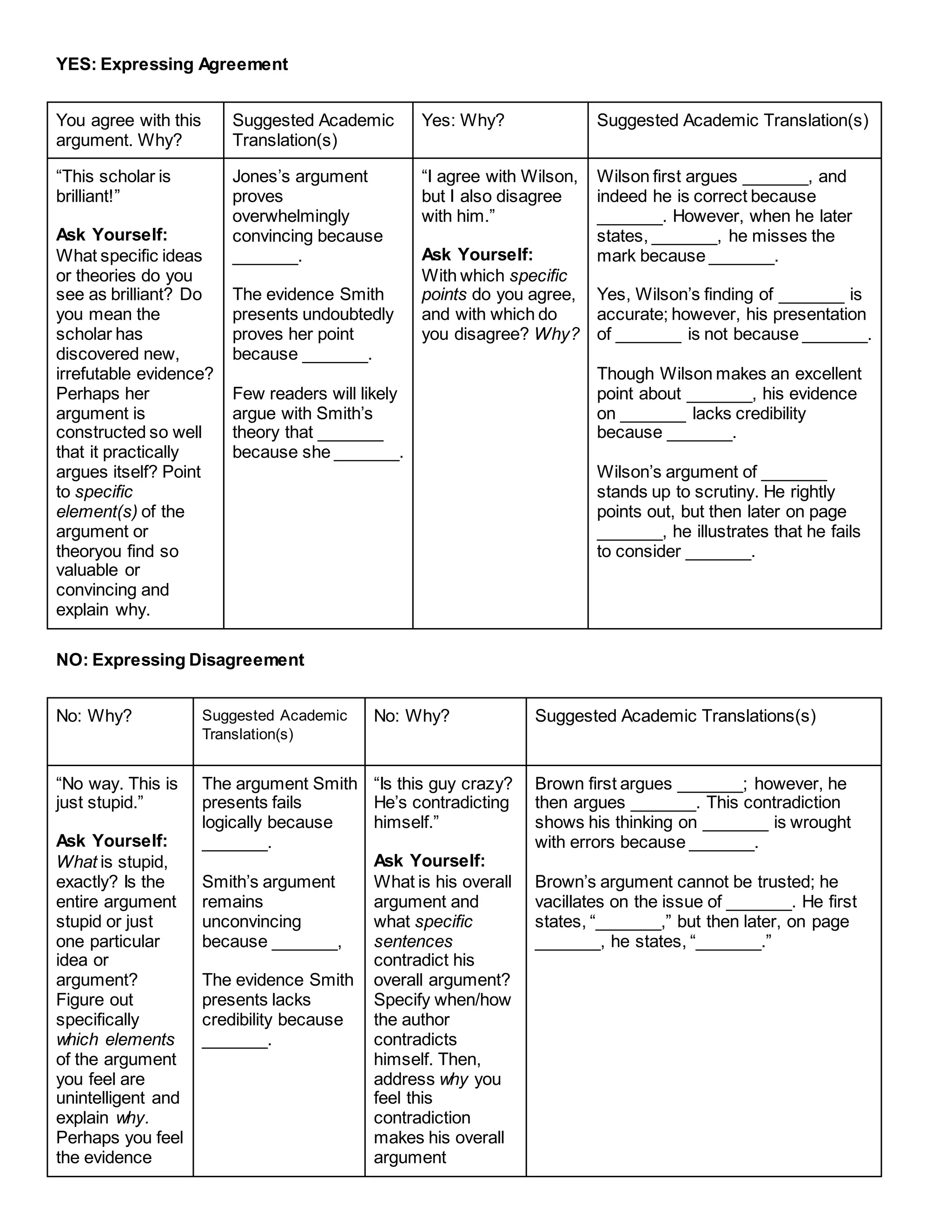 This document provides guidance on effectively agreeing, disagreeing, or expressing uncertainty about an academic argument. It suggests translating colloquial responses like "yes", "no", or "maybe" into more specific academic language. For agreement, it advises identifying the specific ideas or evidence that are convincing. For disagreement, it recommends pointing to logical flaws, lack of evidence, or contradictions. For uncertainty, it suggests acknowledging potential validity while also noting arguments or evidence that are unconvincing. The document aims to move readers beyond simple responses to more substantive engagement with arguments and evidence.
