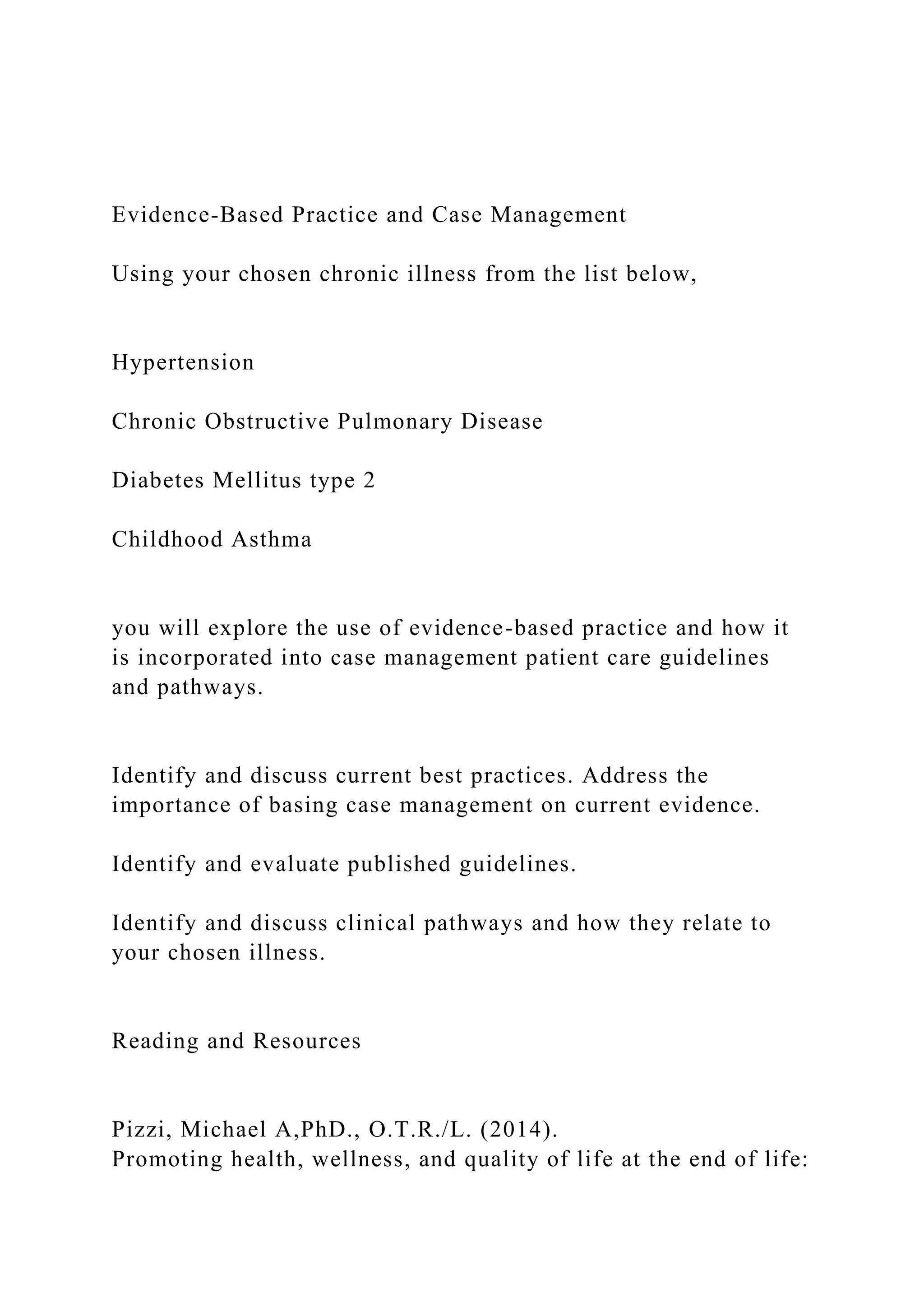 The document outlines the exploration of evidence-based practice in case management for chronic illnesses such as hypertension, COPD, and diabetes. It emphasizes the significance of using current evidence to inform patient care guidelines and clinical pathways. The assignment requires a 4 to 6-page paper with scholarly references, following APA guidelines.