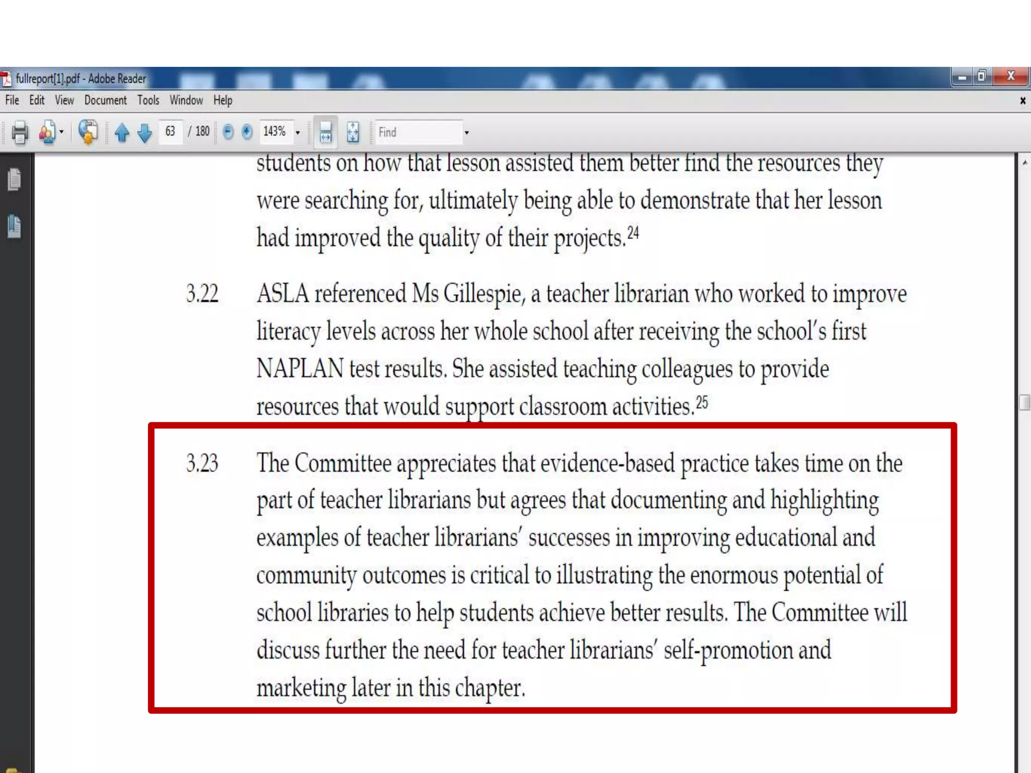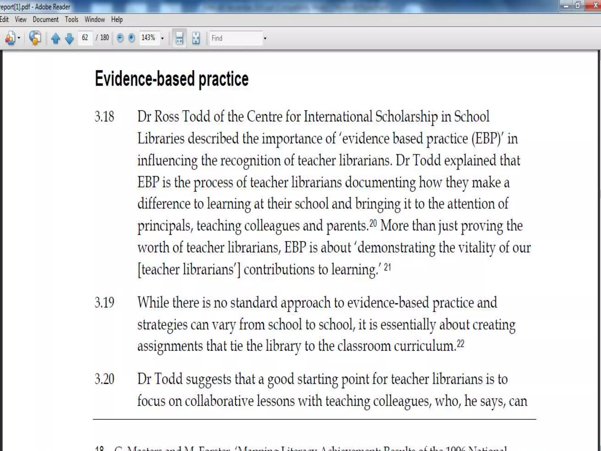 This document discusses evidence-based practice for school libraries. It begins by focusing on concepts, research findings, and strategies related to evidence-based practice. The presenter discusses how the idea of evidence-based school librarianship began in 2001 with a paper on the topic. Research has shown positive impacts of school libraries on student learning outcomes when led by qualified teacher-librarians. Developing the capacity for evidence-based practice is recommended. Evidence-based practice involves using research evidence, practitioner observations, and student feedback to inform decision making and continuous improvement. Tools for gathering evidence locally include analyzing student work and bibliographies.