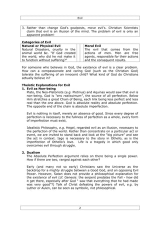 The document discusses the philosophical problem of evil - how can a completely good, all-knowing, and all-powerful God allow evil to exist in the world? It outlines several theistic explanations, including: 1) Evil as non-being, where evil is an absence rather than positive thing; 2) Dualism, where an opposing evil power exists; and 3) Moral theory, where God limits evil by nature but allows free will which can lead to suffering. It highlights the need to understand Augustine of Hippo and Irenaeus' attempts to explain how God's love is compatible with suffering and evil in the world.