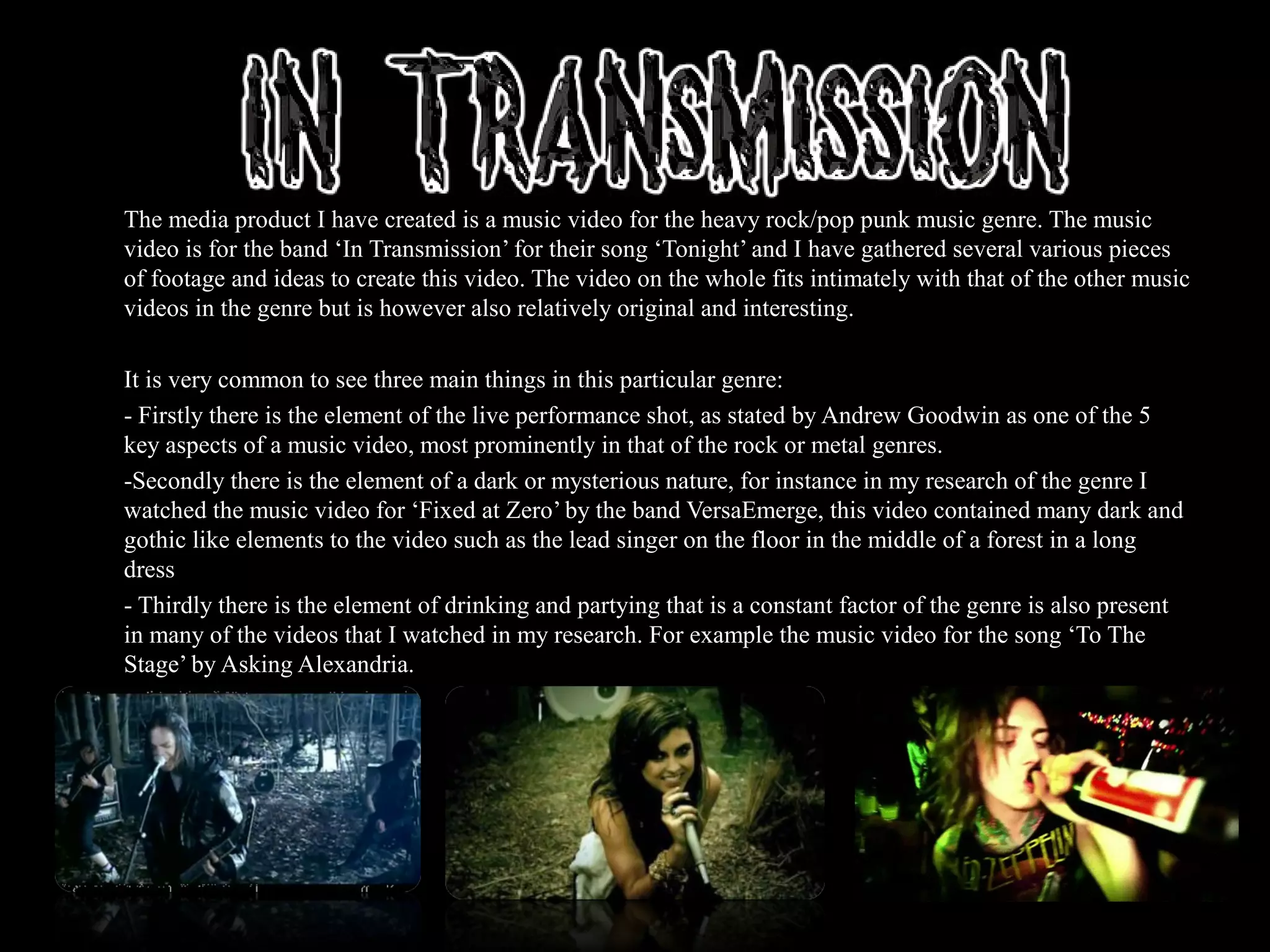 - It is a music video for the heavy rock/pop punk band "In Transmission" for their song "Tonight."
