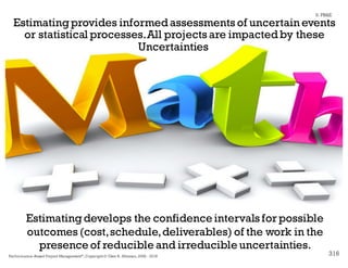The document outlines the integration of agile software development with earned value management (EVM) systems, highlighting the distinctions between agile methodologies and EVM practices. It elaborates on key elements such as estimation techniques, risk management, and the significance of accurate planning for project success. By addressing the challenges and benefits of merging these approaches, the document aims to enhance understanding and application in software-heavy projects.