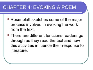 The document discusses Rosenblatt's transactional theory of the literary work, which argues that the reading experience involves two streams - evocation and interpretation - that cannot be separated. It describes the complex process readers go through to evoke a poem from a text, drawing on their personal experiences and past literary knowledge to interpret the work in a way that becomes part of the creative process. Different readers can have varied responses, as the meaning derived depends more on the individual reader than just the text itself.