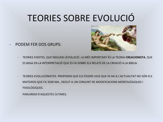 TEORIES SOBRE EVOLUCIÓPODEM FER DOS GRUPS: TEORIES FIXISTES, QUE NEGUEN LÈVOLUCIÓ. LA MÉS IMPORTANT ÉS LA TEORIA CREACIONISTA , QUE ES BASA EN LA INTERPRETACIÓ QUE ES FA SOBRE ELS RELATS DE LA CREACIÓ A LA BIBLIA. TEORIES EVOLUCIONISTES. PROPOSEN QUE ELS ÈSSERS VIUS QUE HI HA A L’ACTUALITAT NO SÓN ELS MATEIXOS QUE FA 3500 MA., DEGUT A UN CONJUNT DE MODIFICACIONS MORFOLÒGIQUES I FISIOLÒGIQUES. PARLAREM D’AQUESTES ÙLTIMES.