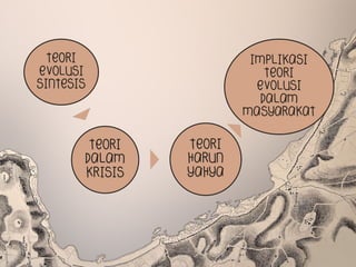 Dokumen tersebut membahas berbagai teori evolusi, termasuk Teori Evolusi Sintesis, keterbatasan Teori Darwin, kontribusi para ahli, kritik terhadap teori evolusi, dan implikasi teori evolusi dalam masyarakat.