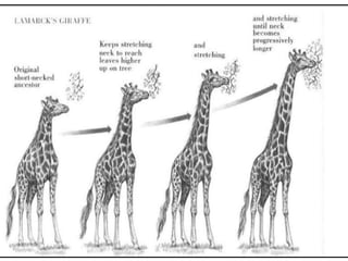 1. It describes Lamarck's theory of evolution which proposed that acquired traits could be inherited. It notes this theory is no longer supported.