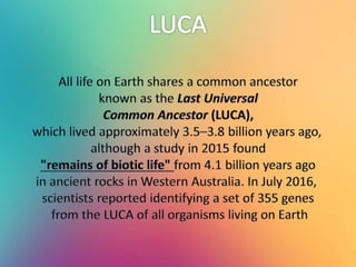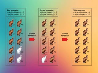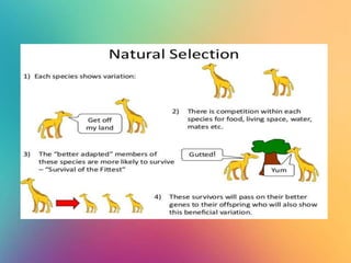 This document provides an overview of key concepts in evolutionary theory, including heredity, variation, mechanisms of evolution, and outcomes of evolution. It discusses how evolution occurs through genetic changes in populations over generations, brought about by various mechanisms like natural selection, genetic drift, and gene flow. Mutation, sex, and recombination also introduce genetic variation in organisms that can then be acted upon by evolutionary forces. The document outlines processes like adaptation, coevolution, speciation, and extinction that are results of evolutionary change over time.