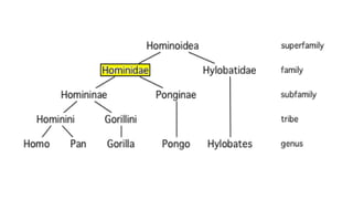 The document outlines the classification, characteristics, and evolutionary history of primates, distinguishing between the two suborders: prosimians (strepsirrhines) and anthropoids (haplorrhines). It discusses various primate families, their habitats, social structures, and adaptations, as well as the evolution from early mammalian ancestors to modern humans. Key points include a trend toward increased brain size and complexity among primates, influencing their behavior and social interactions.