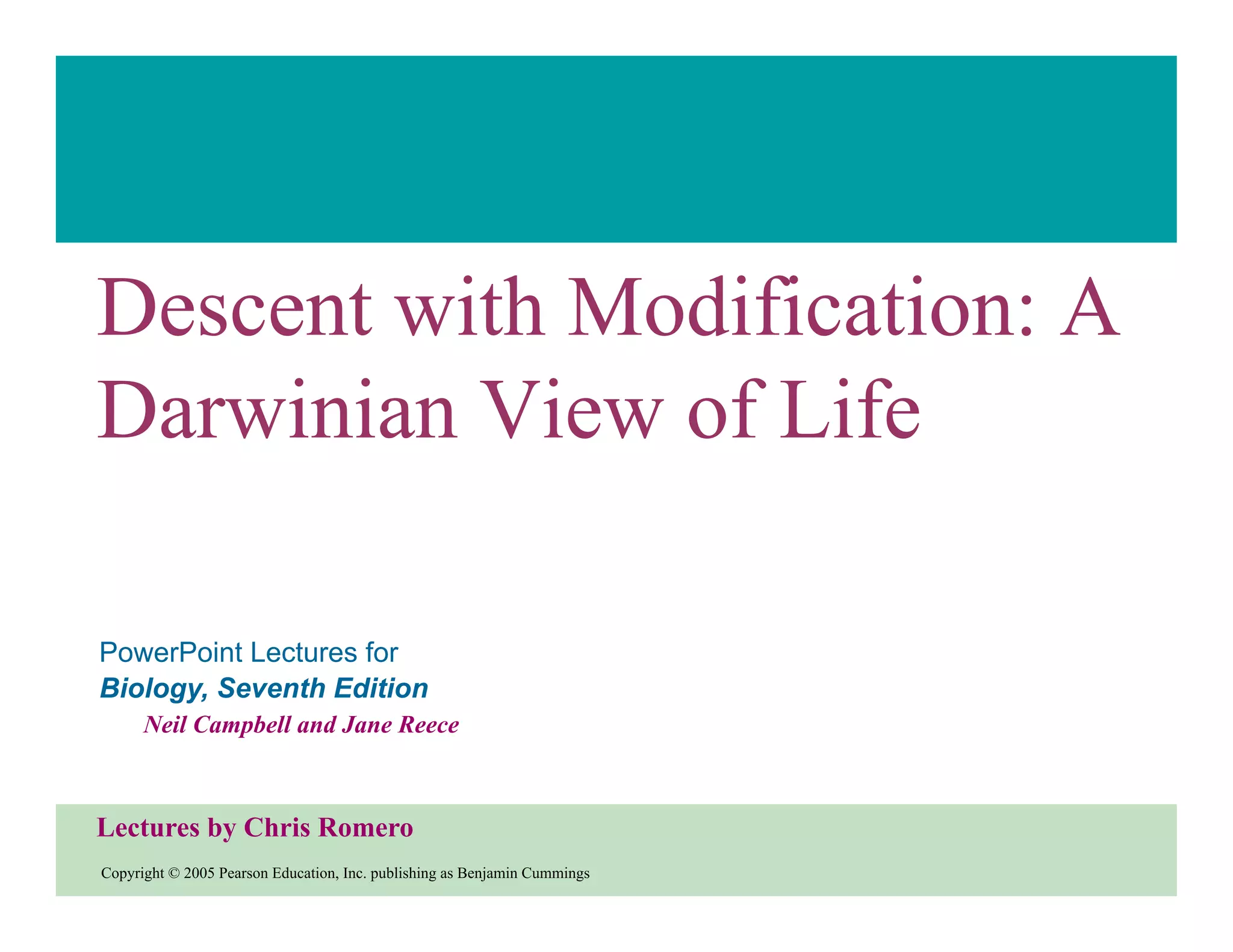 This document provides an overview of Charles Darwin's theory of evolution by natural selection. It discusses key figures and findings that influenced Darwin's thinking, such as Linnaeus' taxonomy, Lamarck's theory of inheritance of acquired traits, and Lyell and Hutton's theories of gradual geological change. The document also summarizes Darwin's two main ideas in Origin of Species: that evolution explains life's diversity and unity, and that natural selection is a mechanism of adaptive evolution. It provides examples of natural selection in action and evidence that supports evolution, such as molecular homologies and transitional fossils.