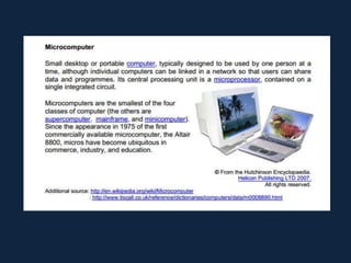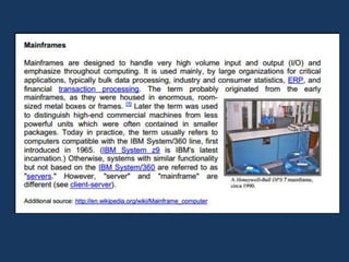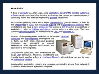 The document discusses different types of computers. It describes single user and multi user systems, and provides details on personal computers (PCs), desktops, laptops, palmtops, workstations, servers, mainframes, minicomputers, supercomputers, and wearable computers. Key points include that PCs are for general use by a single person, desktops are non-portable computers, laptops integrate components into a portable package, and wearable computers integrate applications into devices like watches and clothing.