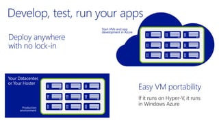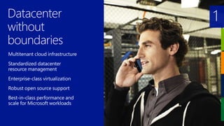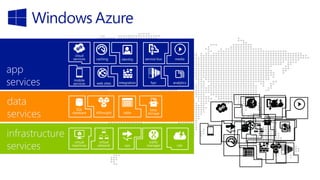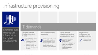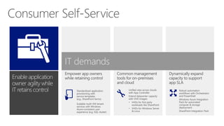 The document discusses various aspects of Microsoft Azure services, focusing on infrastructure management for cloud storage, virtual machines, and data protection strategies. It highlights the integration of Windows Azure Pack with Windows Server for service providers and emphasizes the benefits of efficient backup and recovery solutions. Additionally, it outlines upcoming events and sessions related to cloud management and Microsoft technologies.