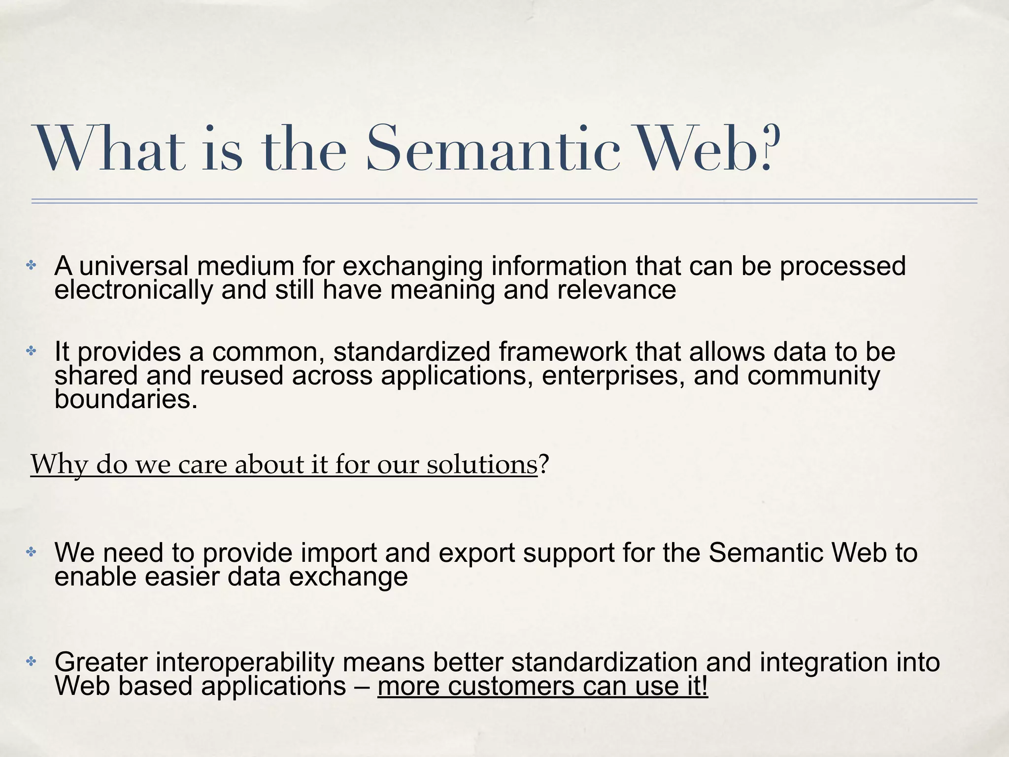 The document discusses the semantic web and metadata management. It defines the semantic web as a universal medium for exchanging information electronically that can be processed and still have meaning. It discusses challenges like overcoming prior integration issues and determining return on investment. It also discusses the importance of the semantic web for business needs like re-purposing data instead of re-creating it. Finally, it discusses getting past relevancy overload on the web by making concept URIs more precise to improve search results.
