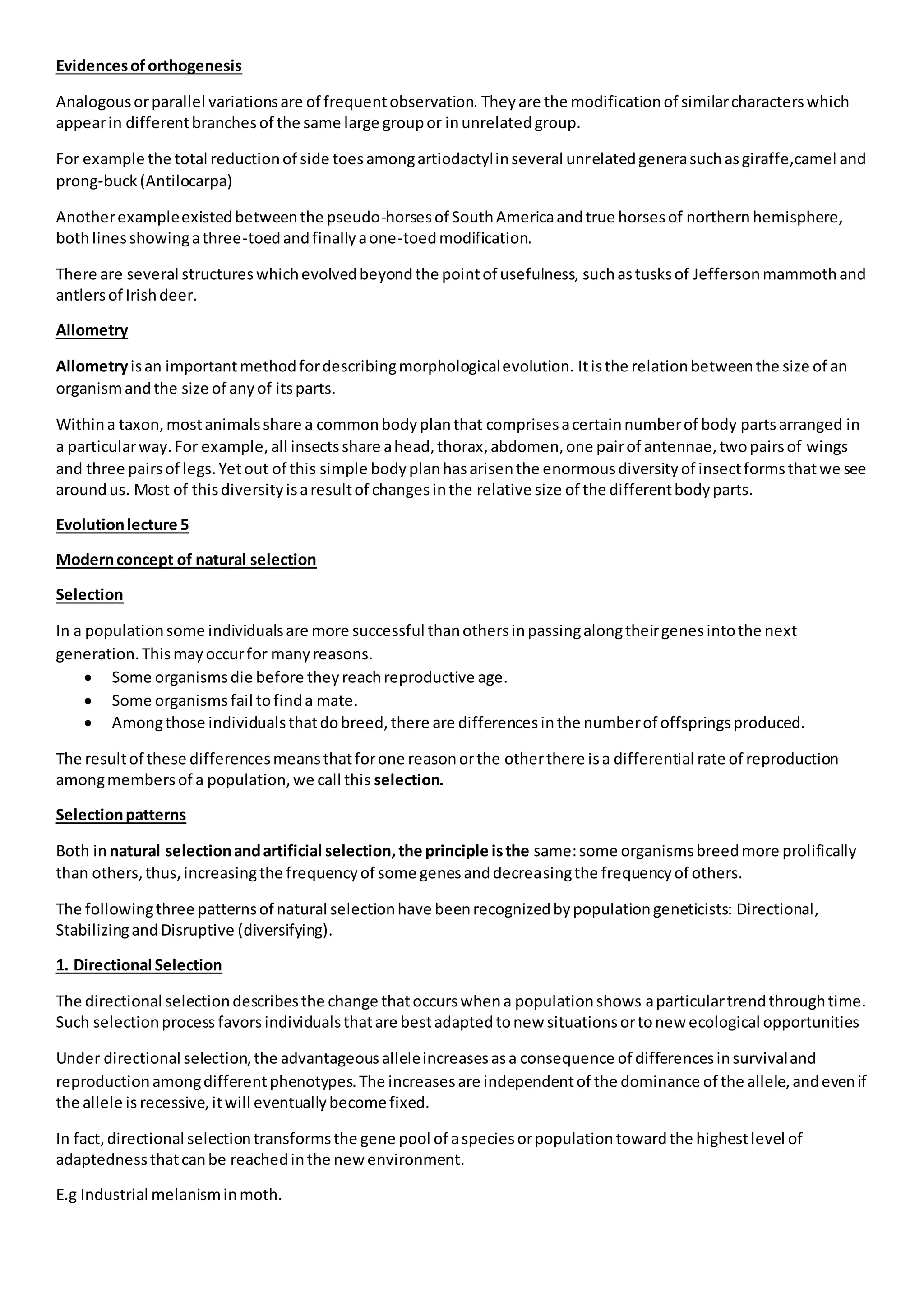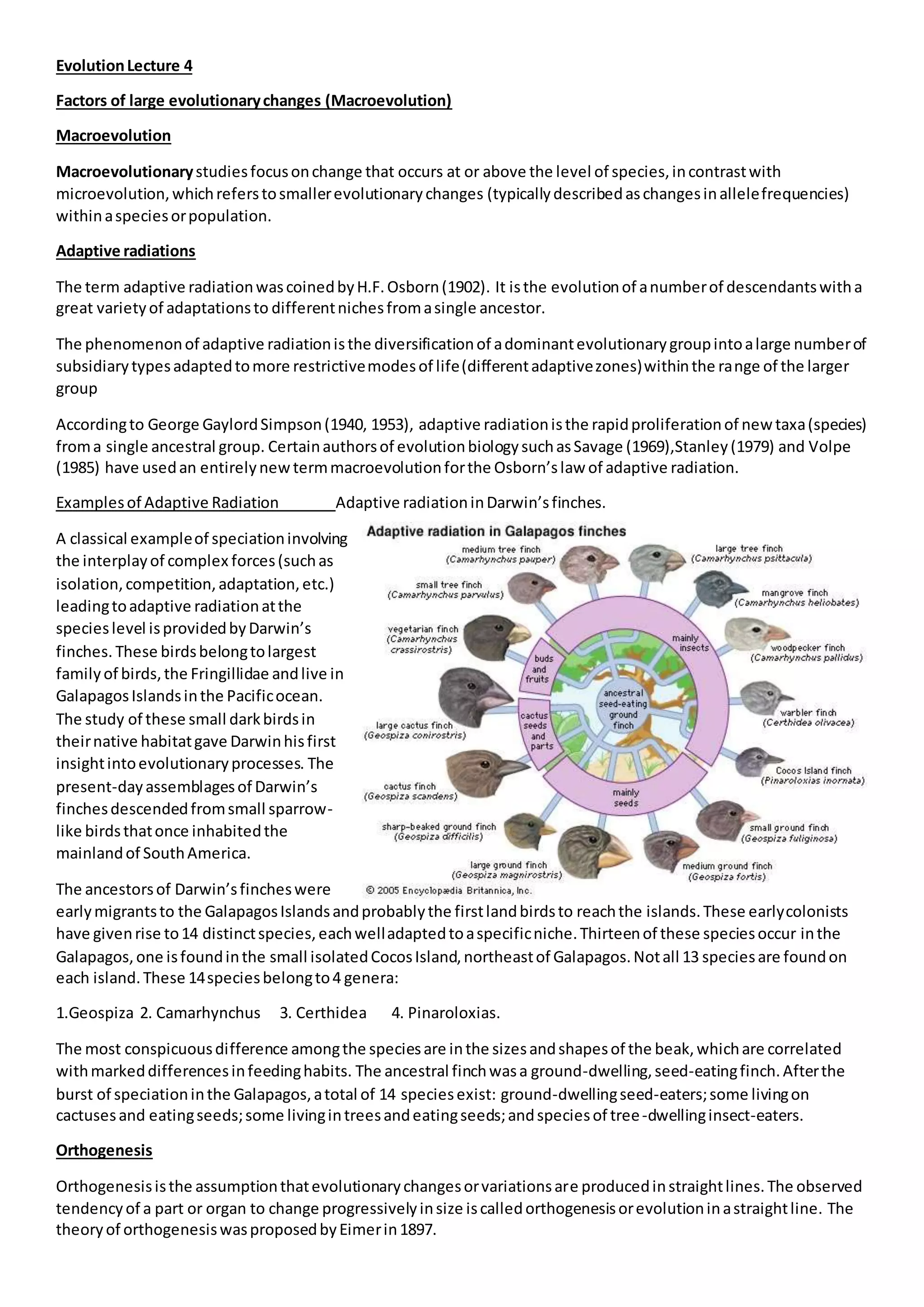 Macroevolution refers to large evolutionary changes that occur at or above the species level, in contrast to microevolution which involves smaller changes within a species. Adaptive radiation is the evolution of many descendant species from a single ancestor, with each species adapted to a different ecological niche. A classic example is Darwin's finches, which evolved from a common ancestor into 14 species with varying beak sizes and shapes adapted to different food sources. Orthogenesis proposed that evolutionary changes occur in a straight line, while allometry describes how body part size relates to overall body size and its evolution.