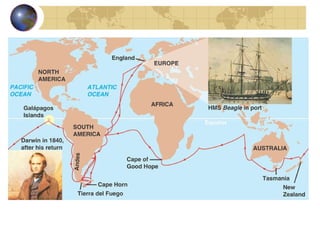 The document discusses evidence that supports the theory of evolution through natural selection. It describes how Charles Darwin developed his theory of evolution after observing variations between species on his voyage on the HMS Beagle. Darwin proposed that organisms evolve over generations through natural selection of heritable traits that increase an individual's chance of survival and reproduction. The document then provides examples of evidence that support evolution, including fossils, comparative anatomy and biochemistry, and experiments simulating early Earth conditions.