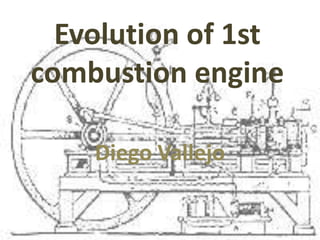 The internal combustion engine evolved over centuries from early designs in the 17th century to widespread adoption in the late 19th century. Key developments included Lenoir producing the first engine to run on gas in 1859, Otto designing the first true internal combustion engine in 1862 that sparked industry support, Daimler inventing the first gas-powered vehicle in 1885, and Diesel receiving a patent for his compression ignition diesel engine in 1893, cementing different engine technologies that are still used today.