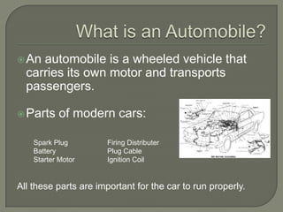 The document summarizes the evolution and life cycle of cars from their invention to modern times. It describes key developments in early steam-powered vehicles in the late 18th century, followed by gasoline-powered cars in the late 19th century pioneered by Karl Benz. Henry Ford later revolutionized car production with the assembly line in the early 20th century. The document then outlines the various stages in a car's life cycle from raw material extraction and assembly to consumer use, repair, and eventual recycling of parts at the end of its life.