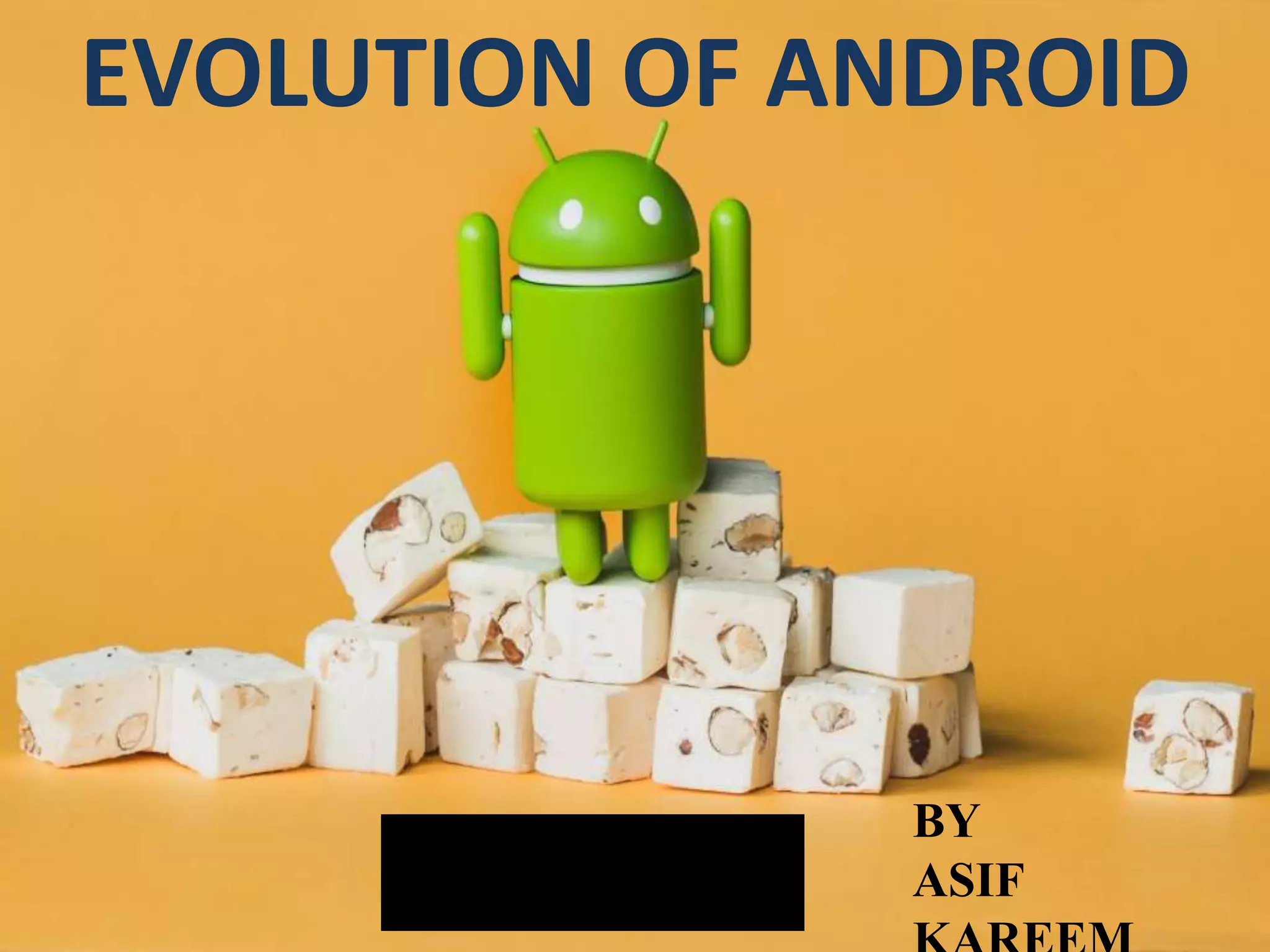 Android has evolved through several versions since its initial release in 2008. The first commercial version was 1.0 Angel Cake in 2008. Subsequent major versions included 1.5 Cupcake, 1.6 Donut, 2.0 Eclair, 2.1 Froyo, 2.3 Gingerbread, 3.0 Honeycomb, 4.0 Ice Cream Sandwich, 4.1 Jelly Bean, 4.4 KitKat, 5.0 Lollipop, 6.0 Marshmallow, and 7.0 Nougat, with each release adding new features and functionality to the mobile operating system. The document traces the history and key developments of the Android OS through its various versions.