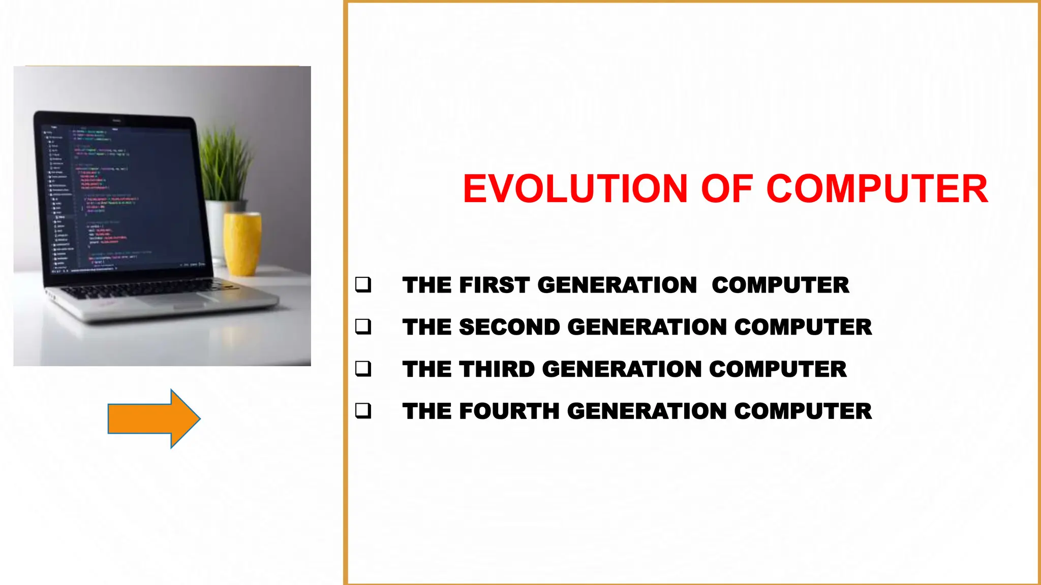 The document outlines the evolution of computers from the first generation using vacuum tubes to the fifth generation featuring artificial intelligence and user-friendly interfaces. It describes key technological advancements and components of computer systems, including the CPU, memory, input/output devices, and system software. Each generation reflects significant progress in size, speed, and capabilities, leading to powerful and compact computers today.