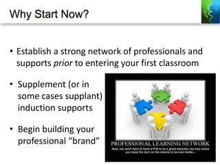 The document discusses the evolution of digital footprints, emphasizing the importance of managing one's online presence for personal and professional development. It outlines three types of digital footprints, offers strategies for cleaning up existing footprints, and provides guidance on establishing a professional online identity through various social media platforms and networks. The importance of building a Professional Learning Network (PLN) is highlighted to enhance career opportunities and professional growth.