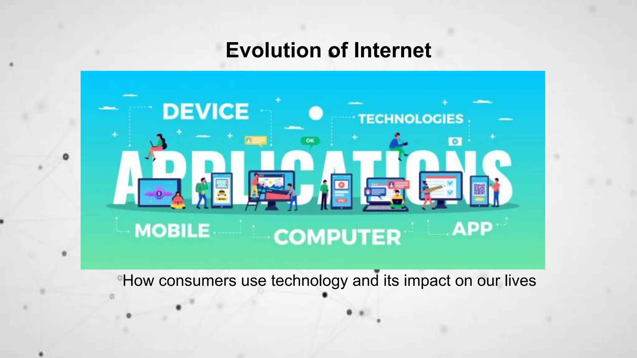 The document discusses the evolution of the internet and how consumers use technology. It provides a brief history of the development of the internet from the 1950s onward. By the 1960s, distributed network concepts were being developed. Today, the internet is a widespread infrastructure that allows electronic commerce, information access, and social connections. The document includes 15 figures that provide statistics on topics like internet usage trends, online activities, search behaviors, and e-commerce purchasing categories. It analyzes how digital technologies are impacting lives and how consumer preferences are changing over time.