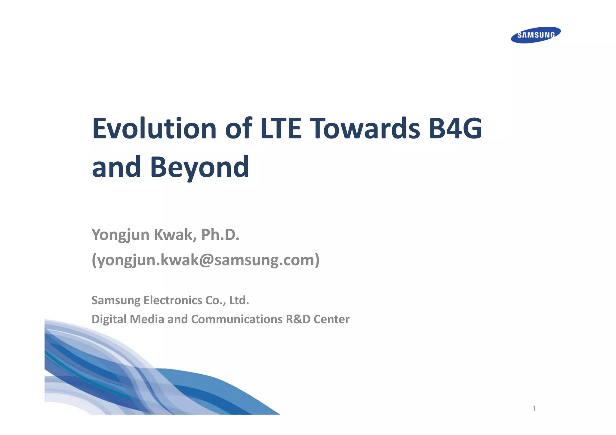 The document discusses the evolution of LTE (Long-Term Evolution) towards beyond 4G (B4G) and 5G, highlighting the standardization efforts by 3GPP and listing candidate technologies like Device-to-Device communication, Full Dimension MIMO, and Network Assisted Interference Cancellation. It outlines the specifications, enhancements, and technology advancements that contribute to the next generation of wireless communication networks. Various industry participants and their roles in developing these technologies are also detailed.