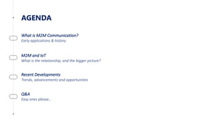 The document provides an overview of the evolution of machine-to-machine (M2M) communication, detailing its history, applications, and developments in the context of the Internet of Things (IoT). It discusses the technical components of M2M communication, including protocols and transport standards, as well as the relationship between M2M and IoT, highlighting recent advancements and opportunities in the field. The presentation emphasizes the ongoing transformation and expanded use of M2M technologies across various industries.