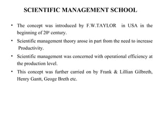 Scientific management emerged in the early 20th century focusing on operational efficiency. Theories were developed by Taylor and Gilbreth emphasizing precision, harmony, and higher pay for more efficient workers. Limitations included disregard for human aspects and authoritarian approaches. Classical management focused on organization-wide principles by Fayol including division of labor and unity of command. The behavioral school used psychology finding social factors improved human relationships. Contingency theory stated the best technique depends on the situation.