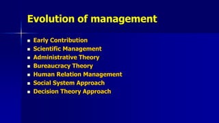 The document outlines the evolution of management theories, highlighting significant contributors and their approaches, such as scientific management by Frederick W. Taylor and administrative theory by Henri Fayol. It discusses the importance of human relations, decision theory, and systems theory, emphasizing the role of interpersonal dynamics and environmental factors in effective management. Critiques of various theories, including concerns about worker exploitation and the complexities of bureaucratic structures, are also addressed.
