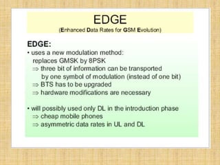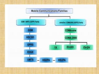 This document provides an overview of wireless communication technologies from 0G to 4G. It discusses the characteristics of each generation including available services, data speeds, and technologies used. The major mobile operators in Egypt are also mentioned.