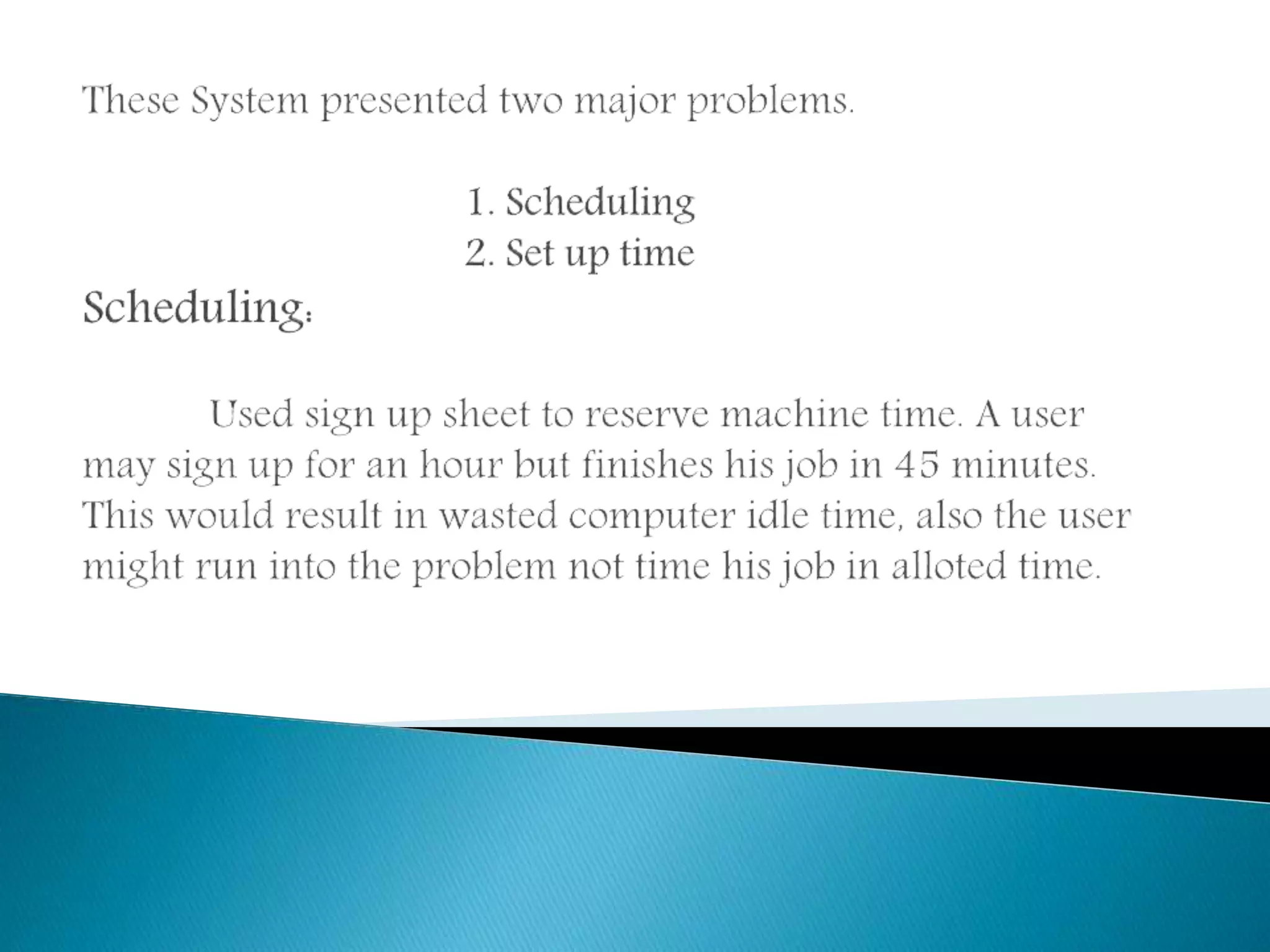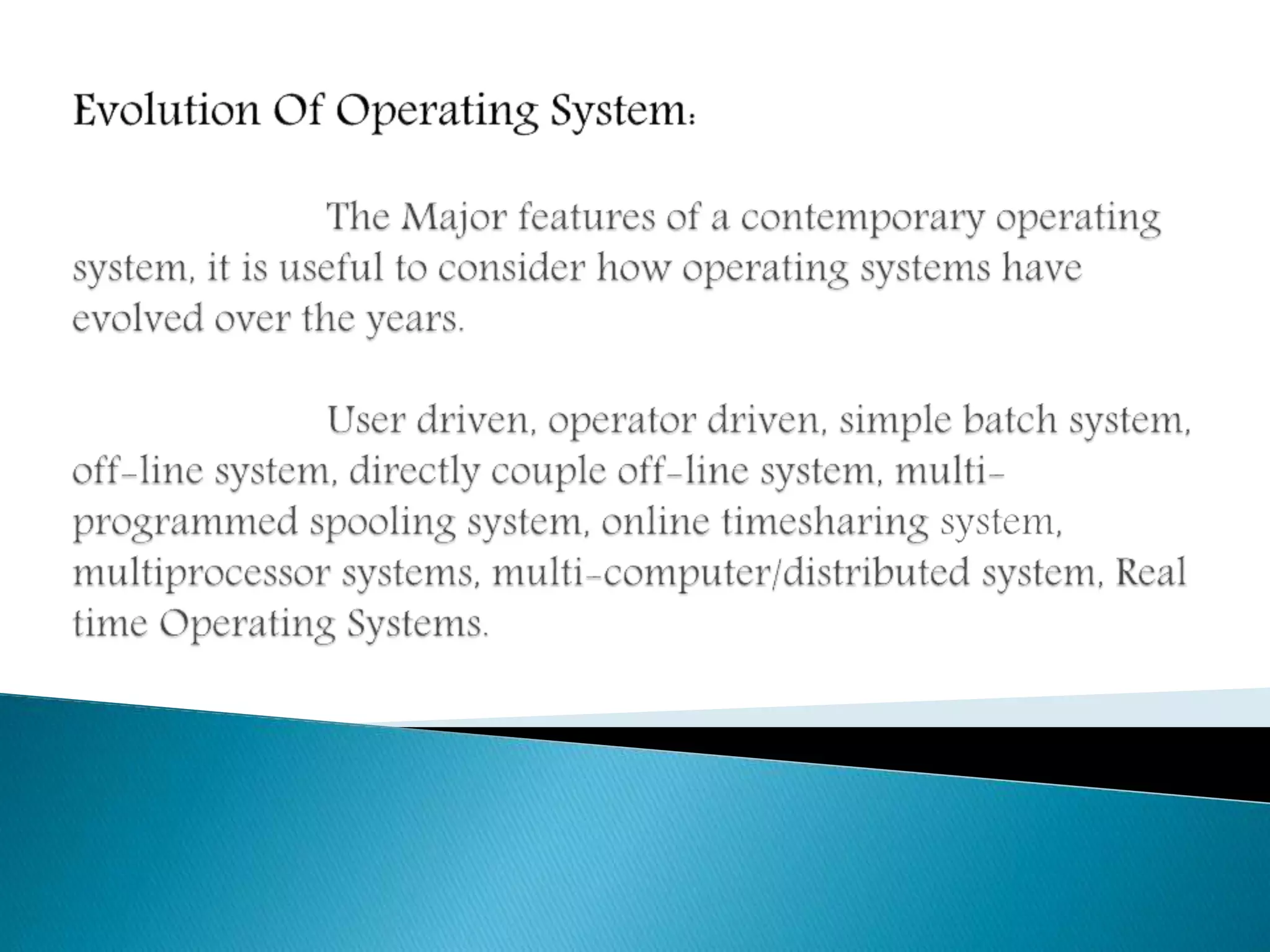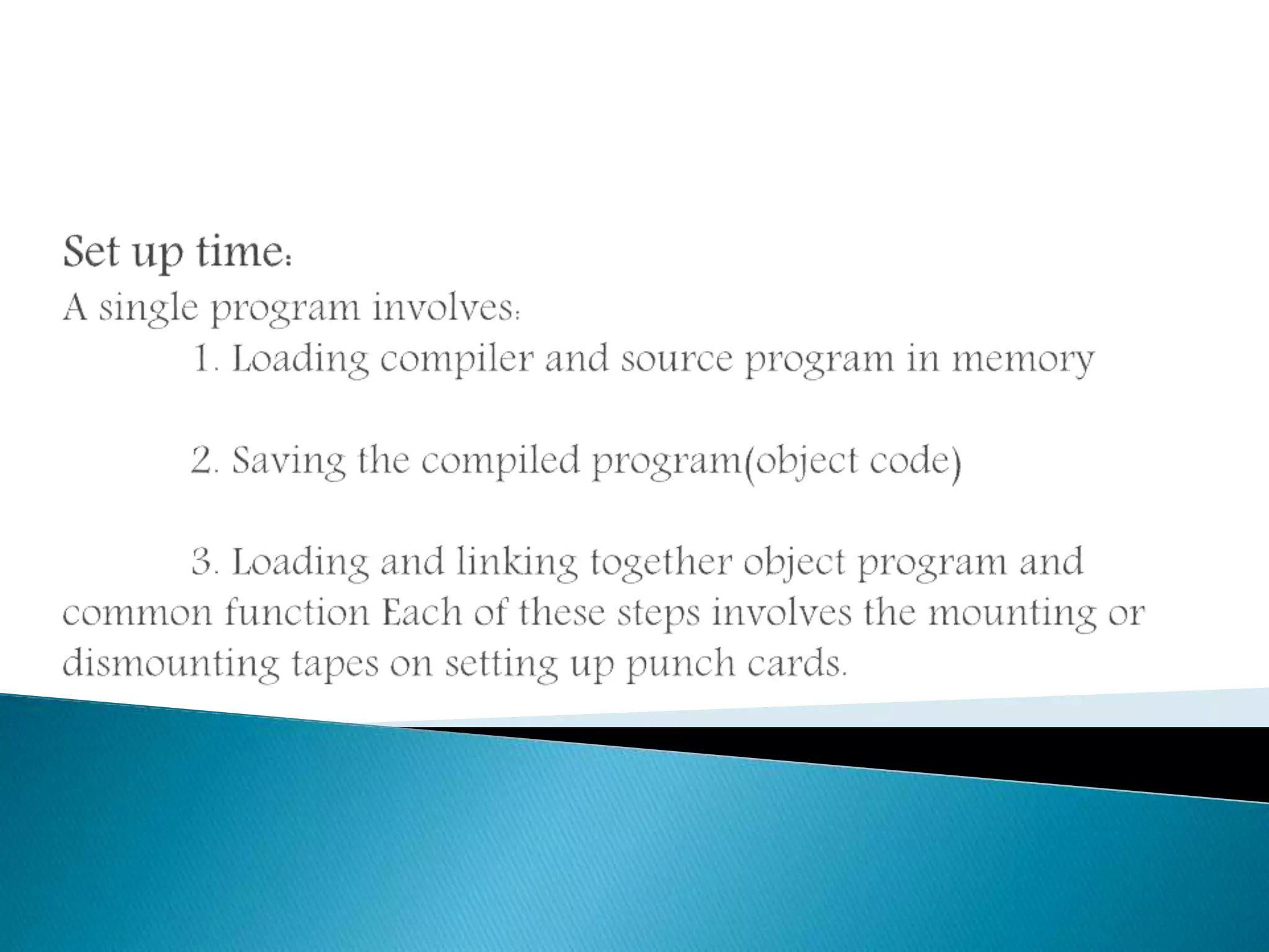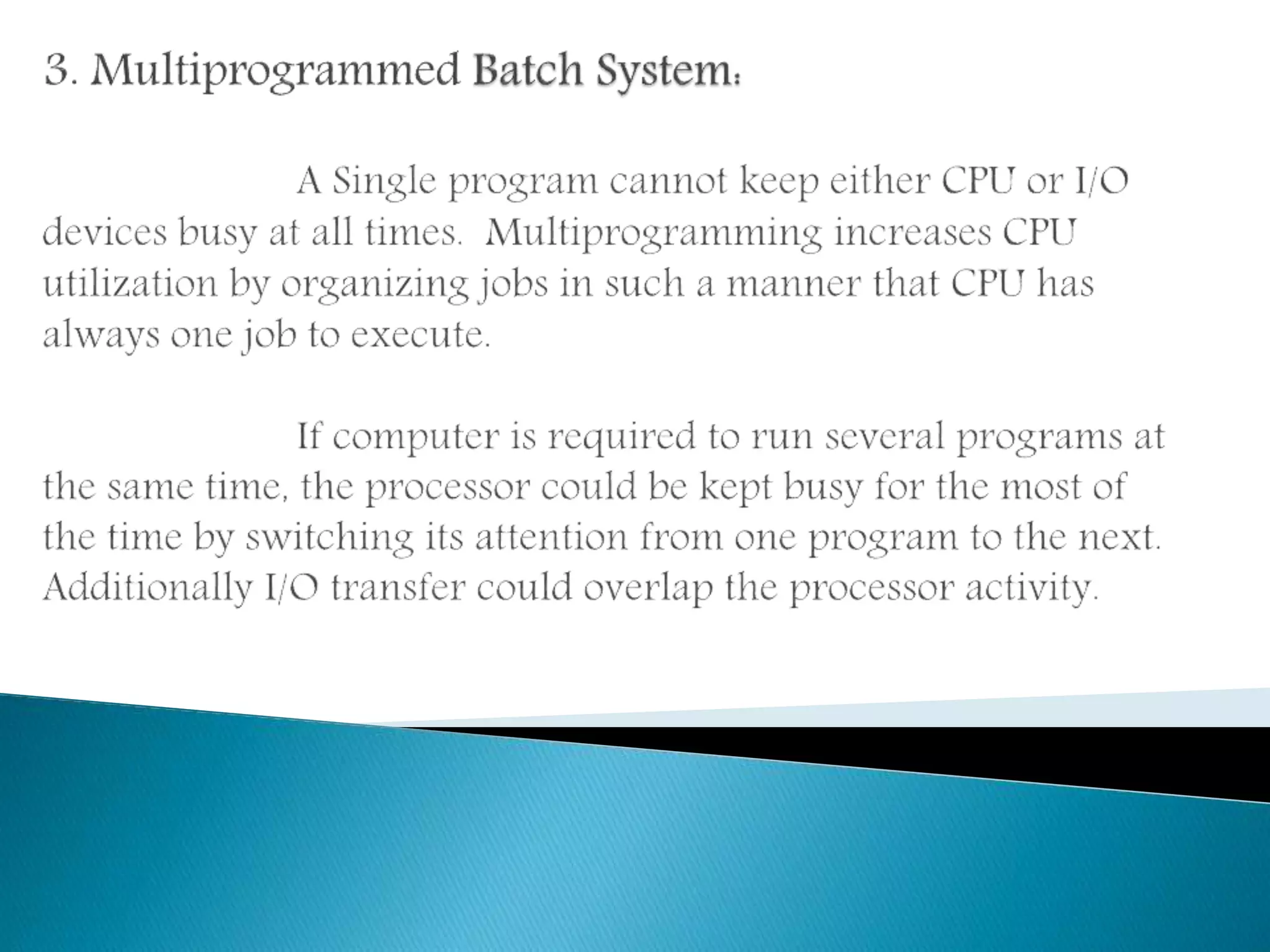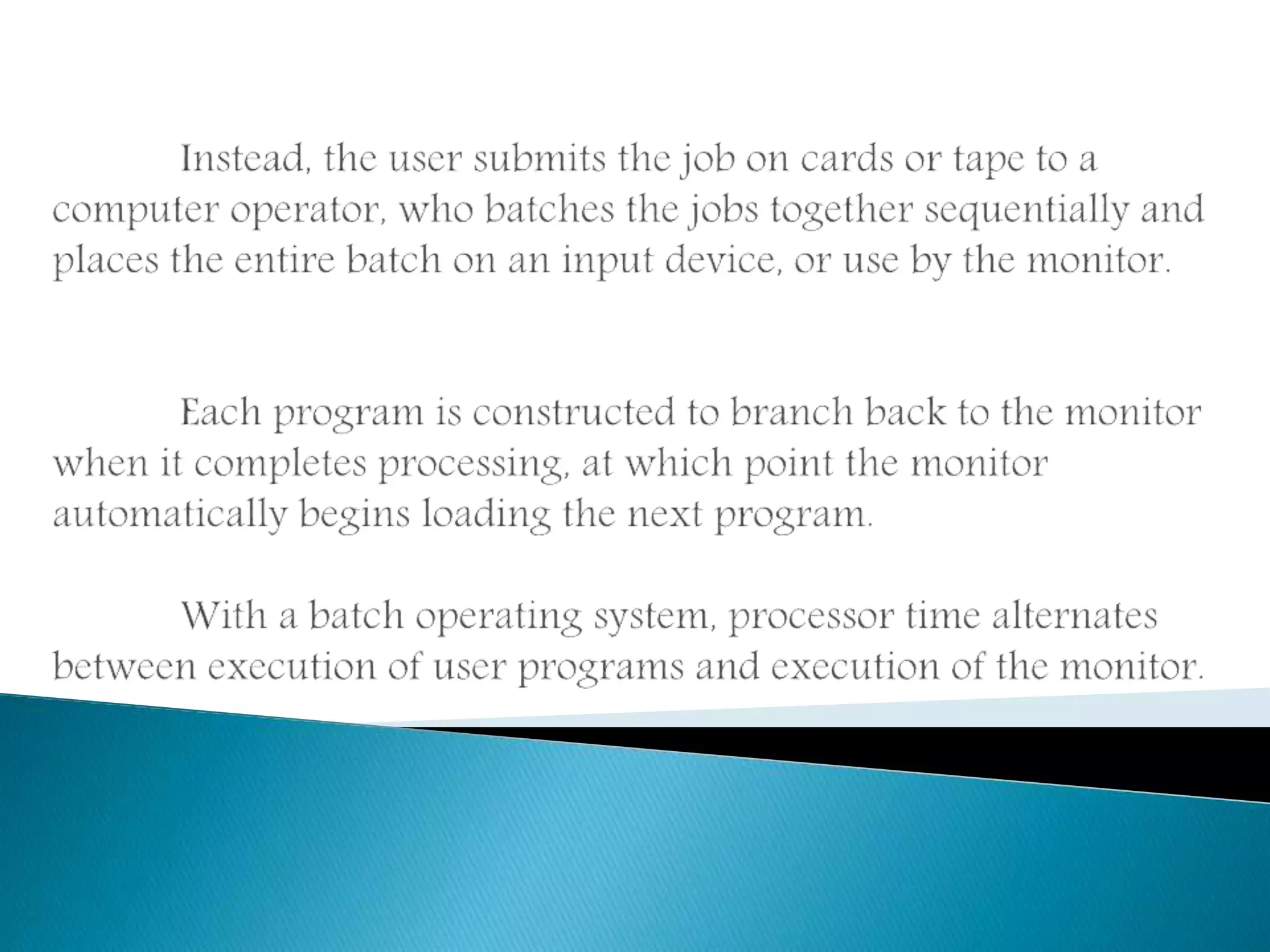 The document discusses different types of early computer processing methods. Serial processing required users to restart the entire setup sequence if an error occurred, wasting significant time. To improve efficiency, simple batch processing was developed where multiple jobs were submitted in batches to maximize processor utilization and reduce wasted time from scheduling and setup between individual jobs. This represented an early form of multiprogramming to better use the expensive computer resources.