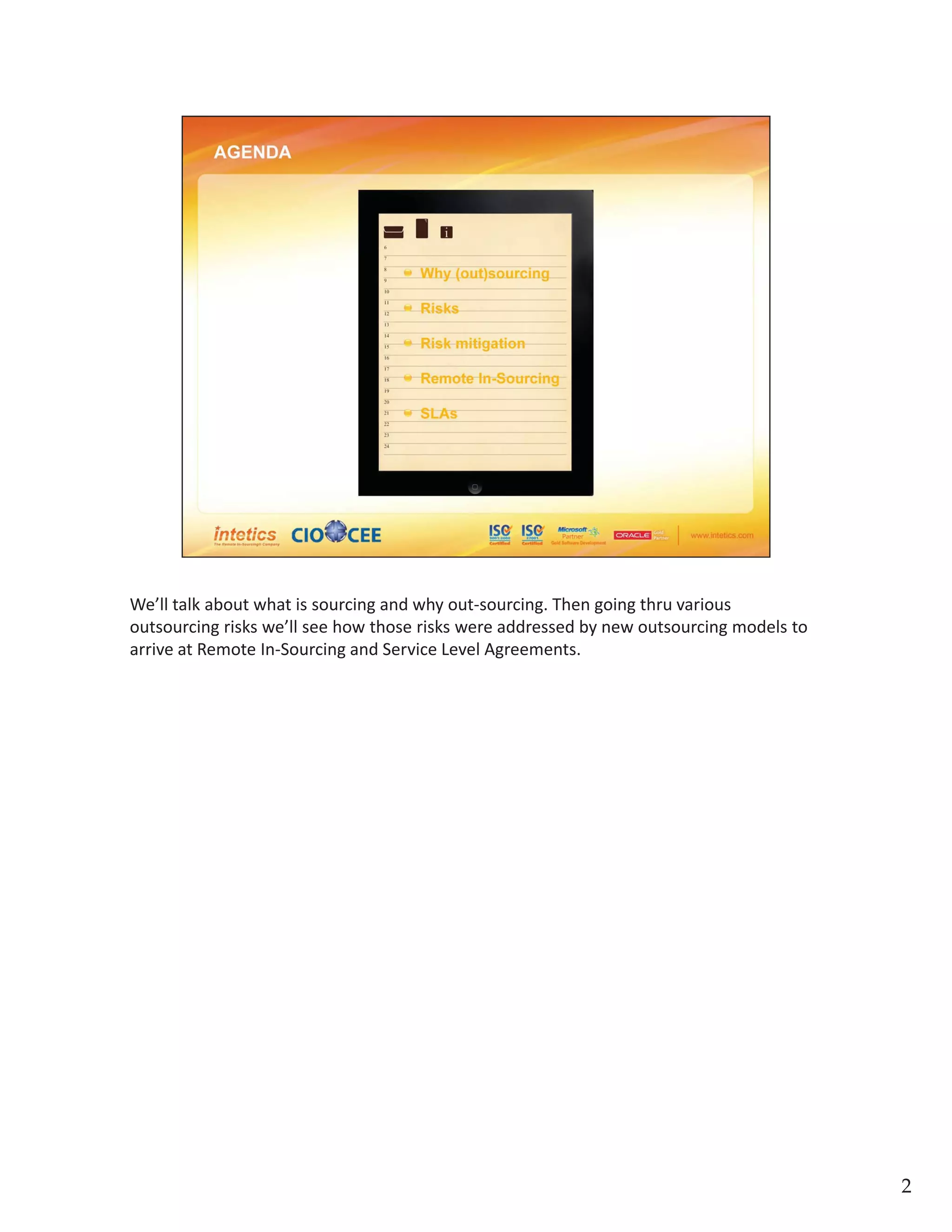 The document discusses the evolution of outsourcing models, focusing on the emergence of remote in-sourcing as a solution to outsourcing risks. It introduces Intetics, a global outsourcing company established in 1995, and highlights the importance of expertise and cost efficiency in outsourcing decisions. The presentation emphasizes the effectiveness of service level agreements (SLAs) in managing outsourcing relationships and improving software development processes.