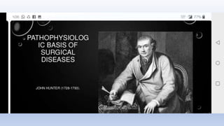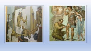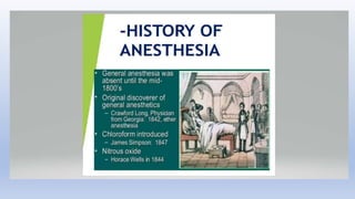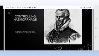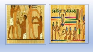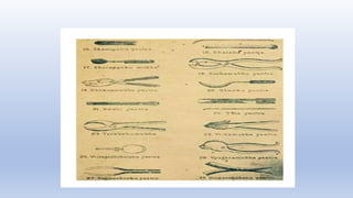 The document summarizes the evolution of surgery from ancient times to the present. Some key developments include the first trepanation procedures in ancient Egypt, advances during the 19th century like the first use of anesthesia and antiseptics, and modern innovations like laparoscopic and robotic surgery. Major surgical achievements accelerated during each era as knowledge and technology progressed.