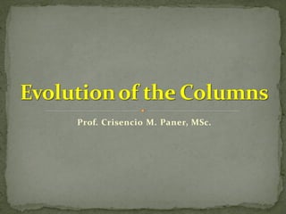 The document discusses the architectural significance of columns, highlighting their evolution and various styles in ancient civilizations, particularly focusing on their structural and decorative roles. It outlines the classical orders of columns developed by the Greeks and expanded by the Romans, including Doric, Ionic, and Corinthian styles, each with distinct proportions and characteristics. Additionally, it briefly mentions the solomonic column and its later popularization in Baroque architecture.