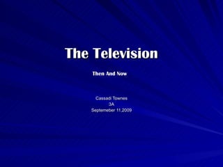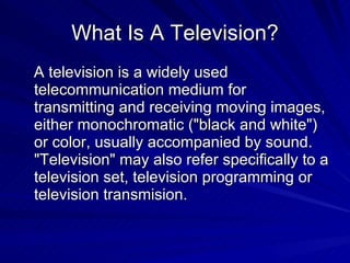 The document provides a history of television from its origins to modern times. It describes what a television is, important early inventions and developments in television technology from 1900 to 1990, materials used in early television sets, and some effects television has had on society both positive and negative. Television has informed society through news broadcasts but can also draw children away from other activities.