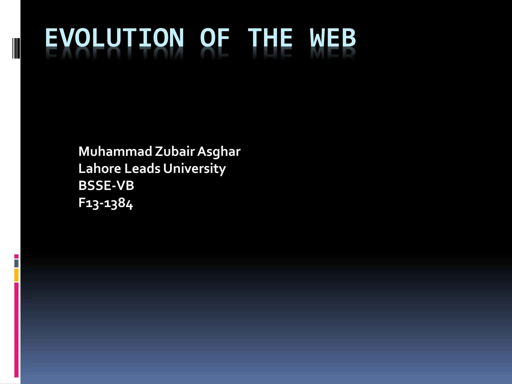 The document traces the evolution of the web from its early origins in the 1970s through recent developments. It discusses important milestones like the development of HTML in the early 1990s to enable web pages, the release of early browsers like Mosaic and Netscape, and the introduction of technologies like JavaScript, CSS, and AJAX in the late 1990s. More recent developments discussed include the launch of Chrome in 2008 and the finalization of HTML5 in 2014. The web has grown from its early days to now having an estimated 100-148 million users.