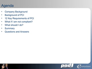 The document discusses PCI Data Security Standards for merchants. It outlines the 12 key requirements of PCI compliance including protecting cardholder data, access controls, monitoring networks, maintaining security policies and vulnerability management. Merchants of different levels have different validation requirements to comply with PCI DSS. Evolution Security Systems provides PCI compliance services like gap analysis, remediation assistance and certification to help merchants achieve and maintain compliance.