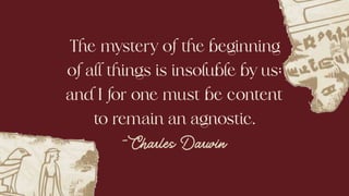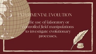 This document discusses Darwin's theory of evolution, including the principles of Darwinian evolution such as natural selection, variation, and inheritance. It provides supporting evidence for evolution theory from fields such as biogeography, embryology, and molecular biology. The document also covers developments in evolutionary theory since Darwin and addresses common misconceptions about the theory of evolution.